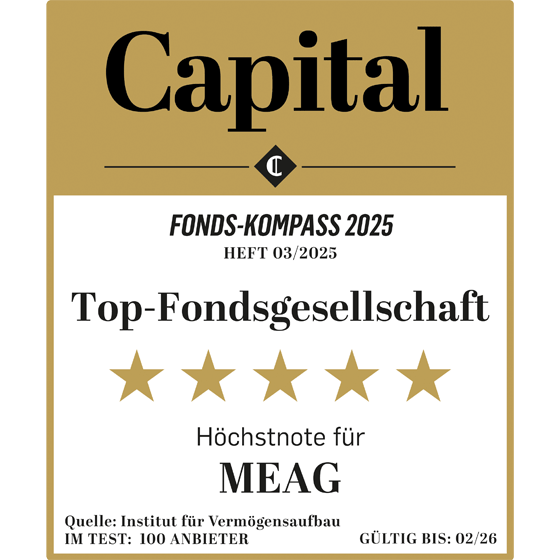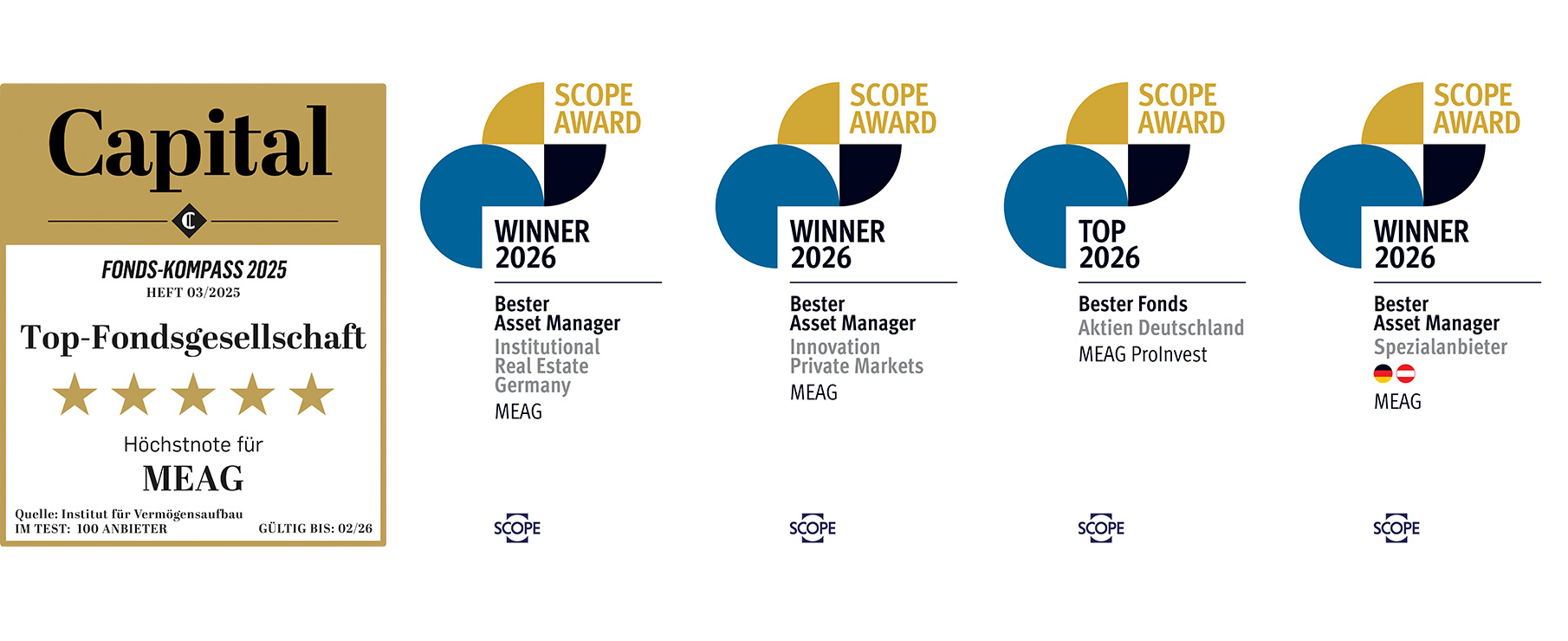 Die MEAG handelt zum Besten der Anleger und Kunden, um nachhaltige Vermögenszuwächse zu realisieren. Auszeichnungen in der Vergangenheit sind kein Indikator für zukünftige Wertentwicklungen und Auszeichnungen.