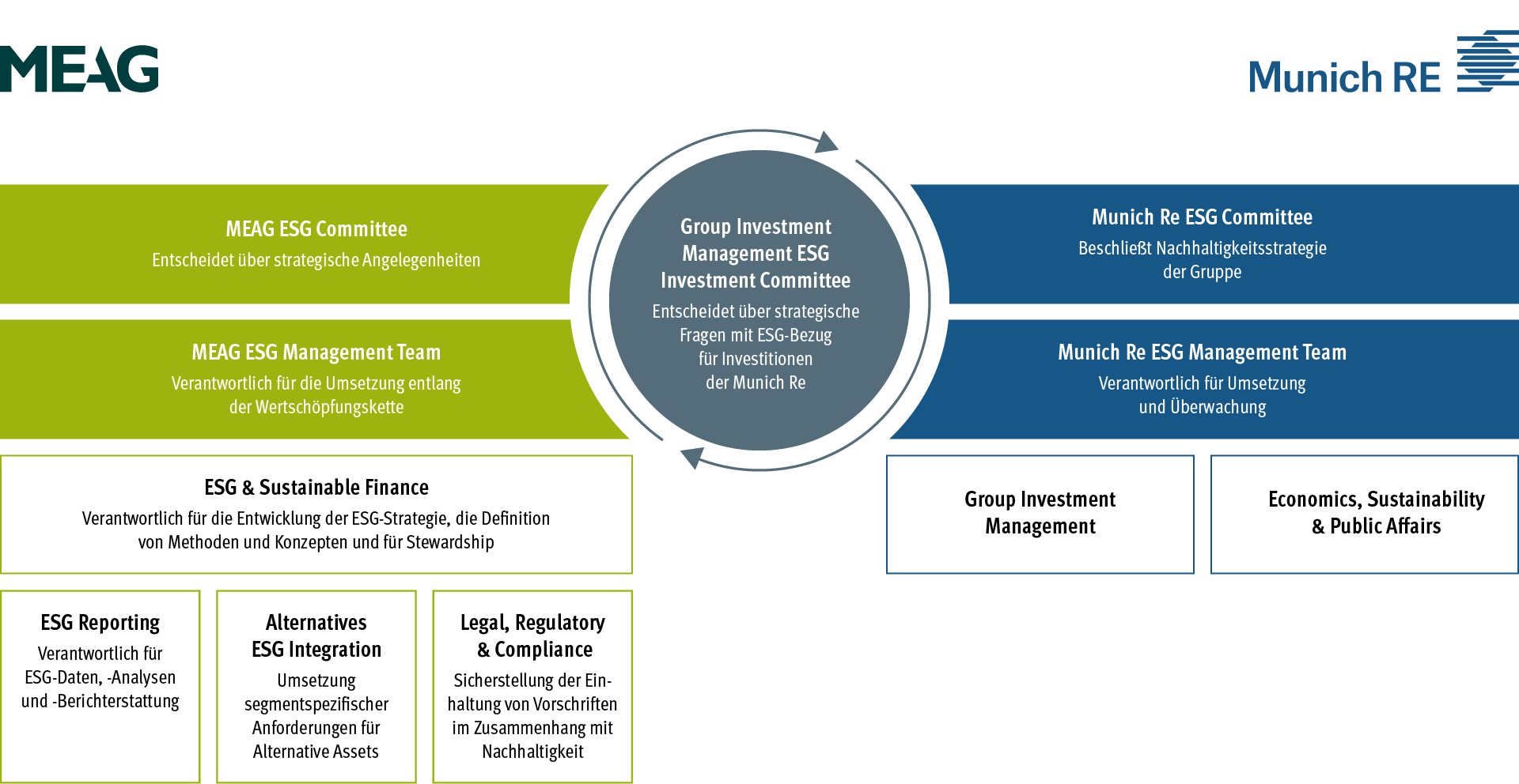 Um die unternehmensweite Ausrichtung und Umsetzung der ESG-Strategie sicherzustellen, hat MEAG eine ESG Governance-Struktur eingerichtet. Die ESG-Governance der MEAG ist an die ESG-Governance von Munich Re angeglichen und in diese eingebettet. Das Group Investment Management ESG Investment Committee ist ein Gremium der Munich Re in welchem MEAG vertreten ist und das über strategische ESG-bezogene Fragestellungen im Zusammenhang mit Investitionen der Munich Re entscheidet. Das Committee dient als Forum, um die Abstimmung zwischen MEAG und Munich Re zu ermöglichen.