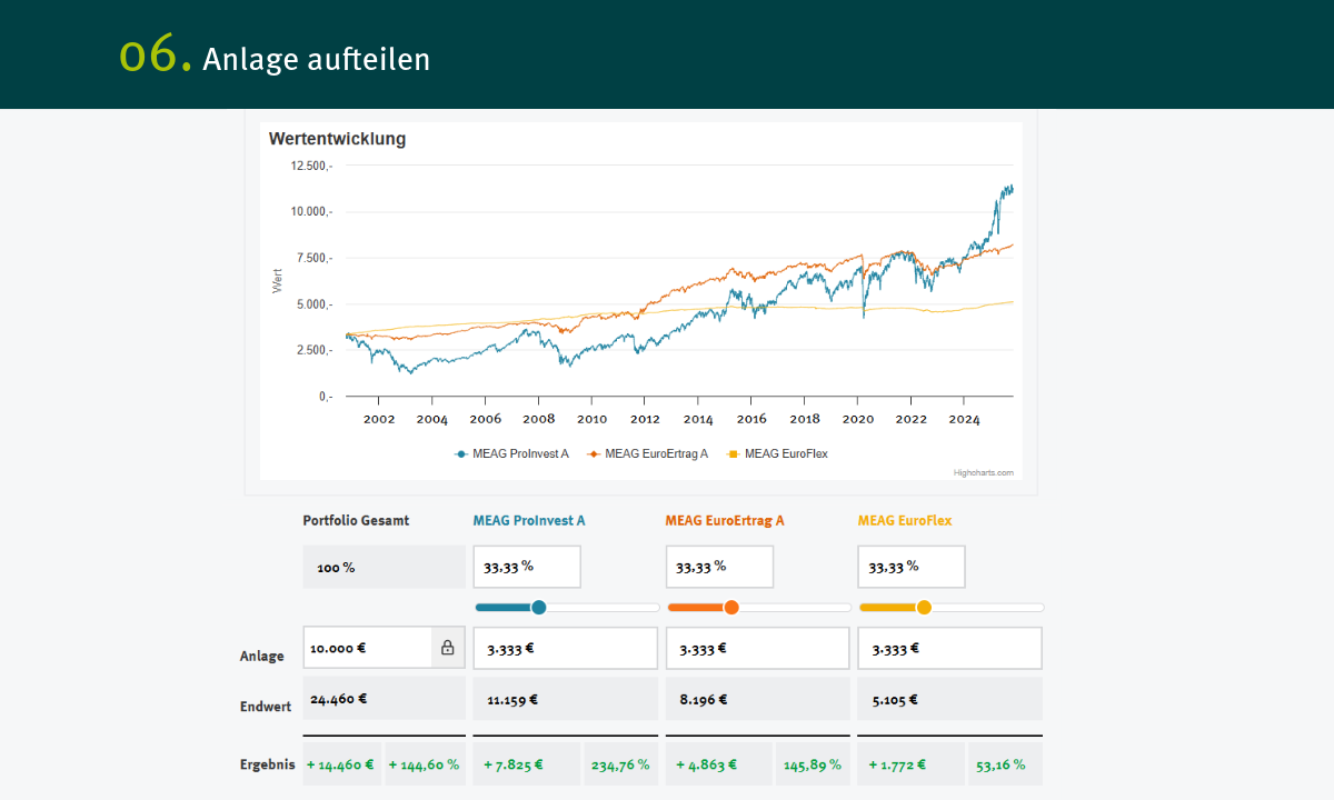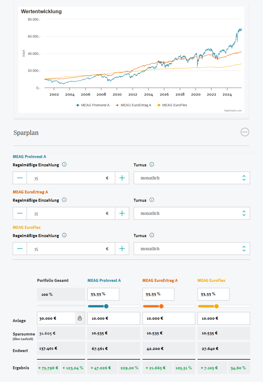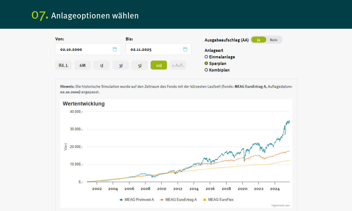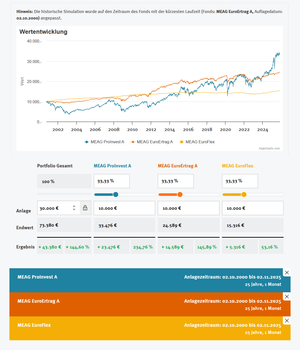 Da bis zu drei Fonds dargestellt werden können, wird außerdem der im Anlegertyp stabil zugeordnete Rentenfonds MEAG EuroFlex, als Beispiel für einen Fonds mit kurzfristigem Anlagehorizont, hinzugefügt.