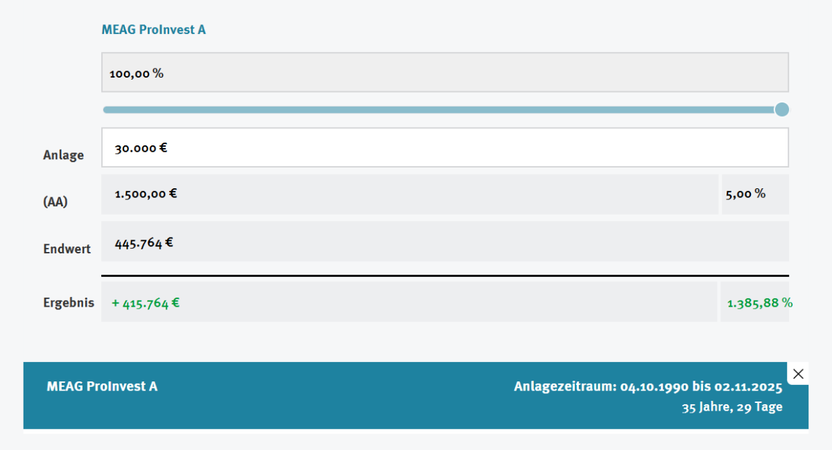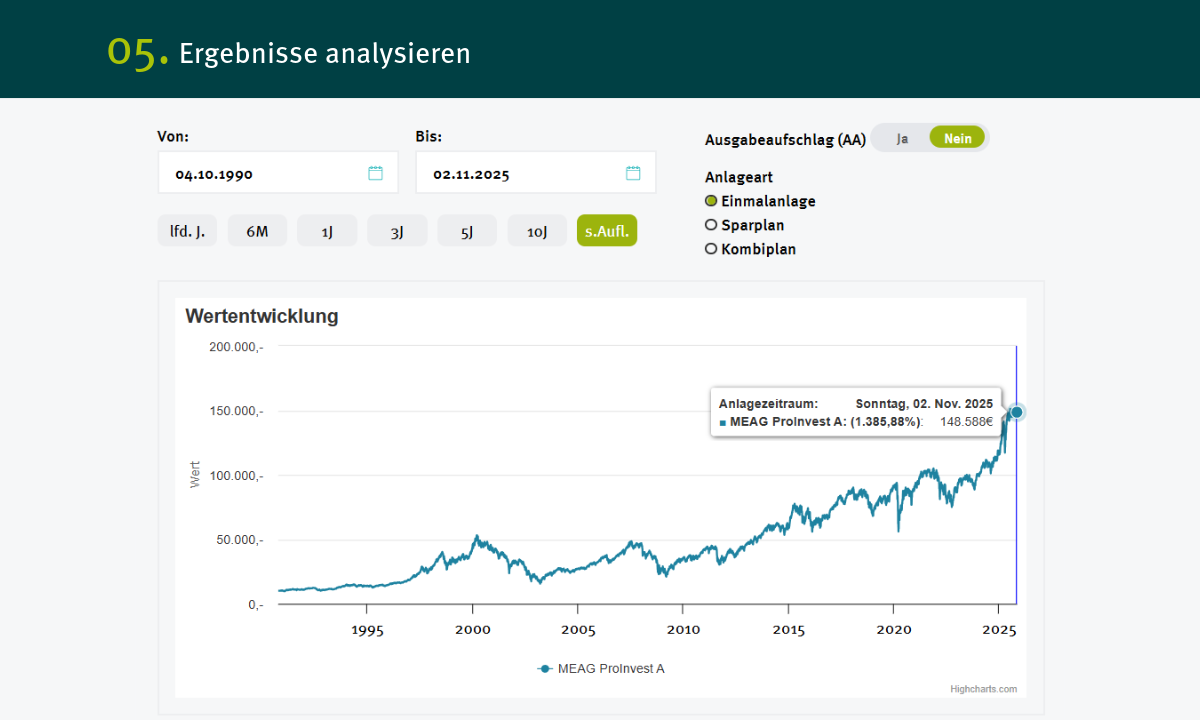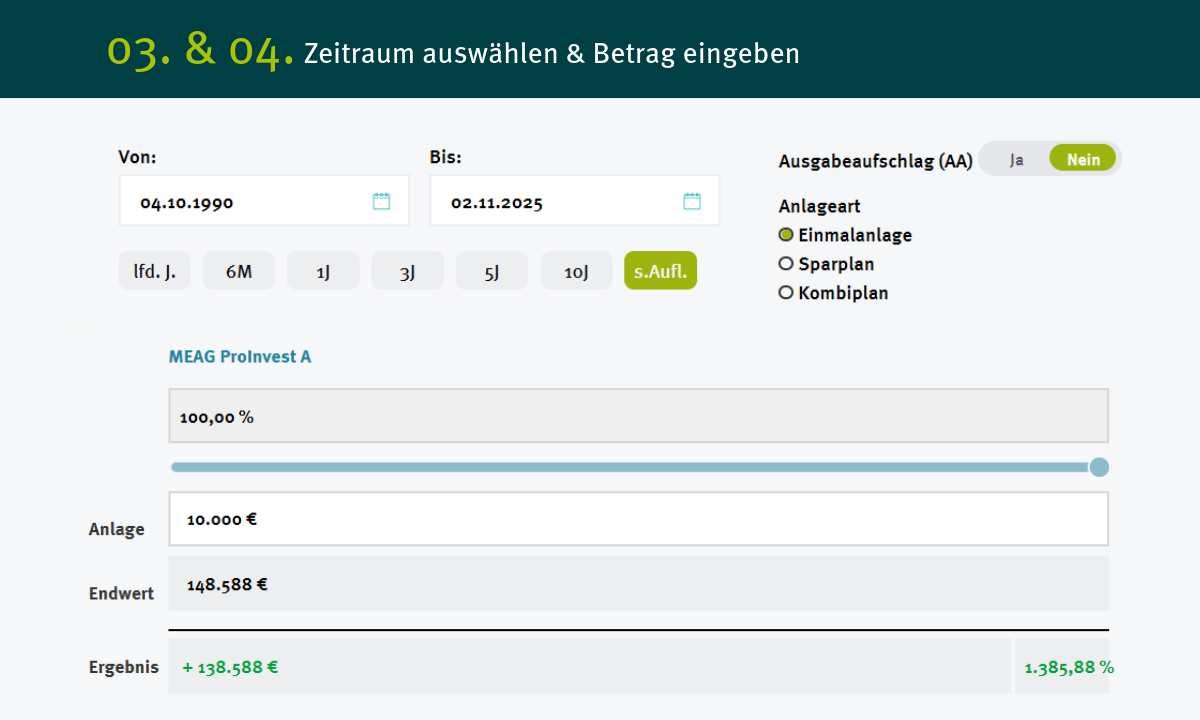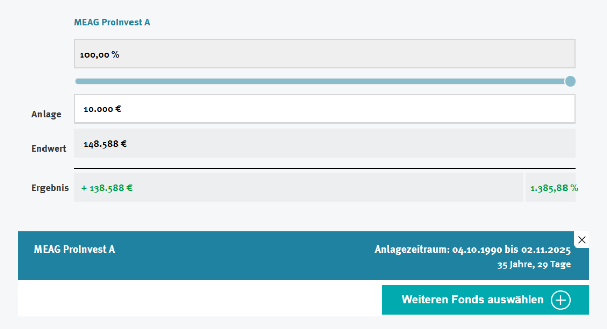 Da bis zu drei Fonds dargestellt werden können, wird außerdem der im Anlegertyp stabil zugeordnete Rentenfonds MEAG EuroFlex, als Beispiel für einen Fonds mit kurzfristigem Anlagehorizont, hinzugefügt.