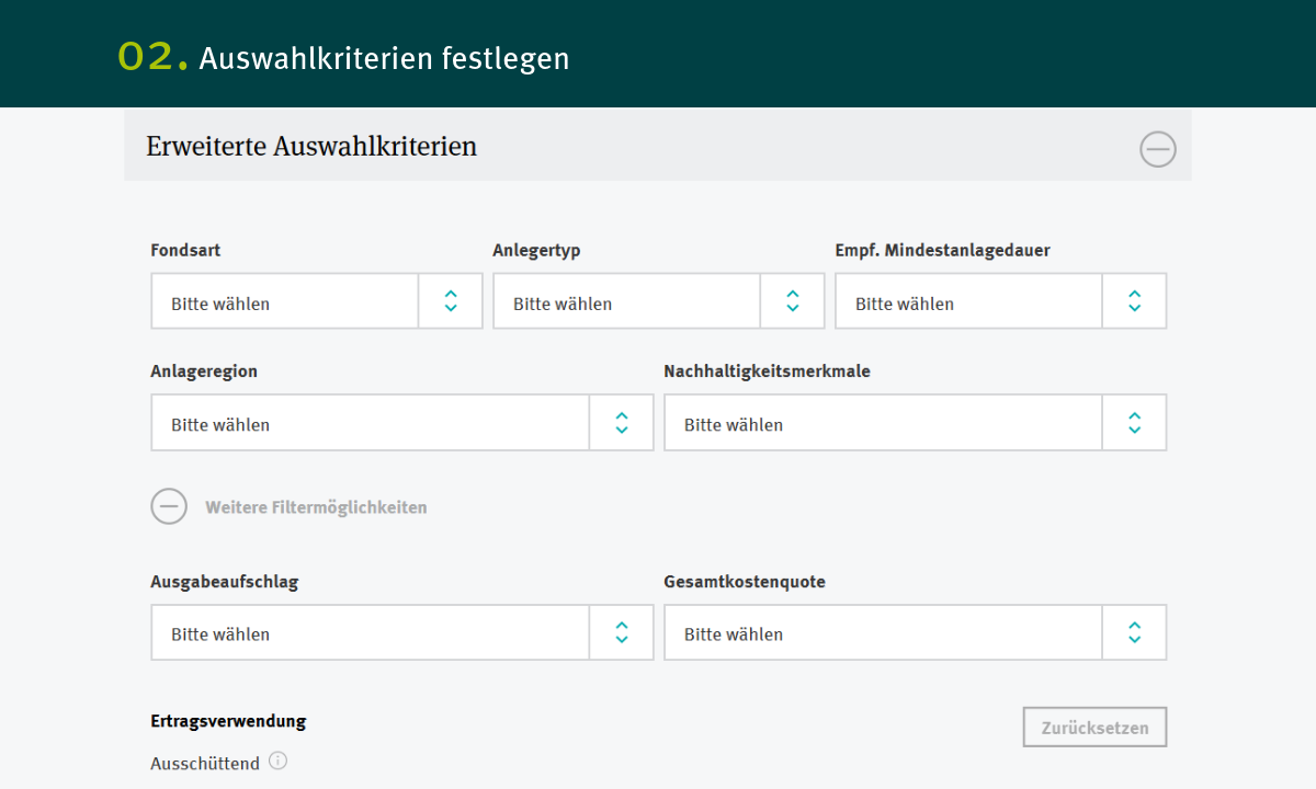 Zunächst wird beispielhaft der risiko- und chancenorientierte Aktienfonds MEAG ProInvest A mit langfristigen Anlagehorizont und erhöhter Volatilität ausgewählt. Die Auswahl erfolgt ganz einfach per Klick auf die entsprechende Kachel oder über die Suchfunktion.