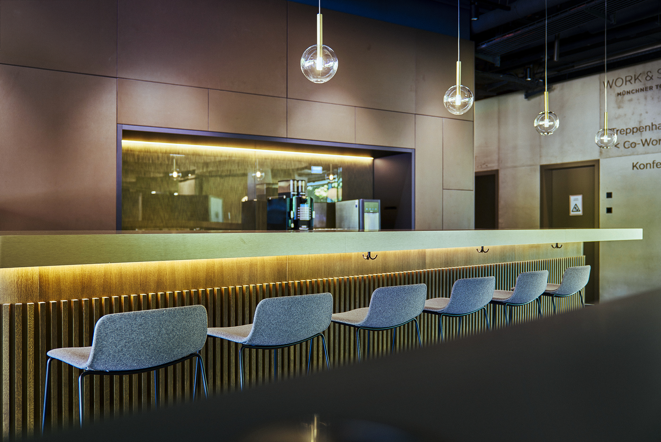 Zentraler Treffpunkt in der Lobby ist die Cafébar mit verschiedenen Sitzgelegenheiten.Für Public-Viewing-Events steht dort ein großer Bildschirm zur Verfügung und ein Snackautomat versorgt alle Mieterinnen und Mieter jederzeit mit kleinen Snacks und Getränken.