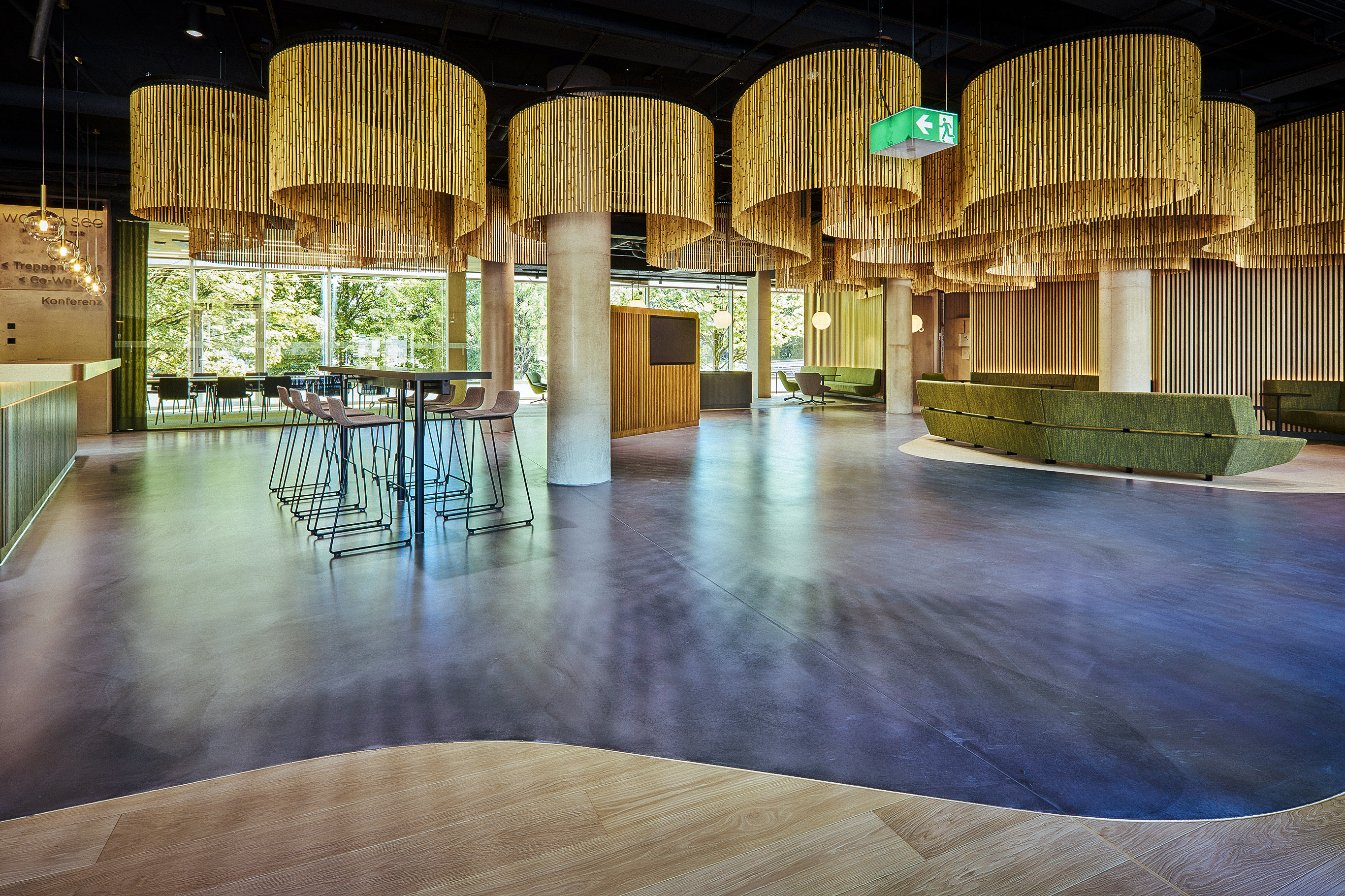 Vom Warte- und Aufenthaltsbereich in der Lobby erreichen Sie die oberen Stockwerke. Eine Lounge vor dem Konferenzraum dient als Empfangs- und Pausenbereich. Dort finden Veranstaltungen statt, die, bei Bedarf, von der Lobby abgetrennt werden.