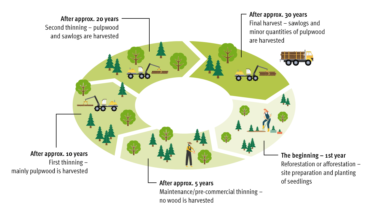 There are a variety of forestry activities during the lifetime of a forest – here is an example of the life cycle of a forest in the southern United States: